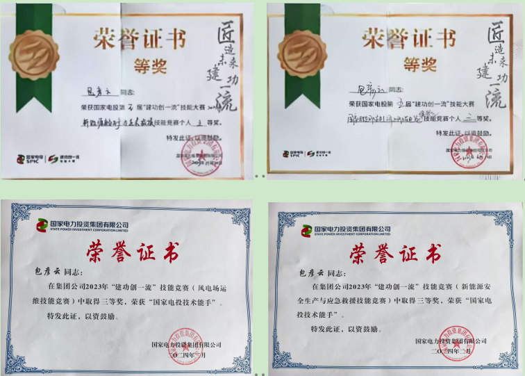 工作期间,曾荣获国家电投第五届“建功创一流”技能大赛2023年新能源安全生产与应急救援技能竞赛个人三等奖、风力发电(海上风力发电)运维职业技能竞赛个人三等奖、国家电投2024年技能竞赛风电场运维技能竞赛“国家电投技术能手”、新能源安全生产与应急救援技能竞赛“国家电投技术能手”等荣誉。