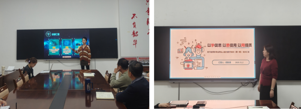 随后,近期外出参加高水平培训及学术会议的六位教师围绕各自参加的培训项目,结合学院专业特色与教学实际,进行了凝练而充实的分享。汇报内容涵盖新形态教材编写、人工智能赋能教育、数字创意人才培养以及骨干教师专业发展等多个领域。