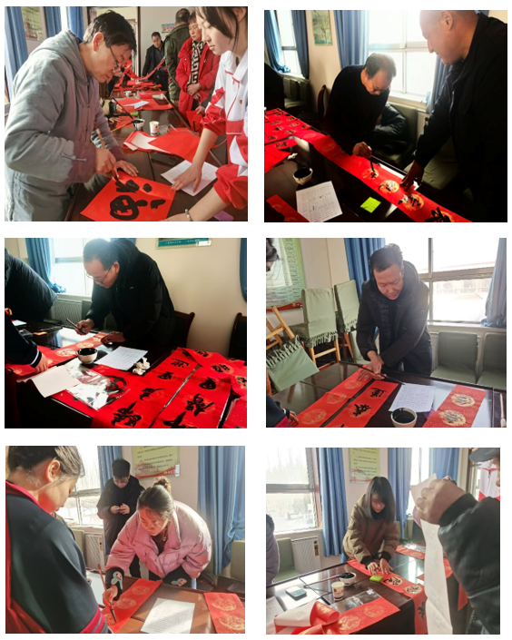 此次活动由乡村振兴学院牵头,在学校飞天书画院的大力支持下,邀请旅游烹饪学院王权朝老师、信息工程学院院长武兴宝、体育与健康学院院长马鑫、教育与艺术学院高立武老师和张婷老师及 8 名学生志愿者共同参与,组成一支“专业 + 志愿”的服务队伍,为村民提供写春联、送祝福等文化服务,让校村共建更有温度、更接地气。