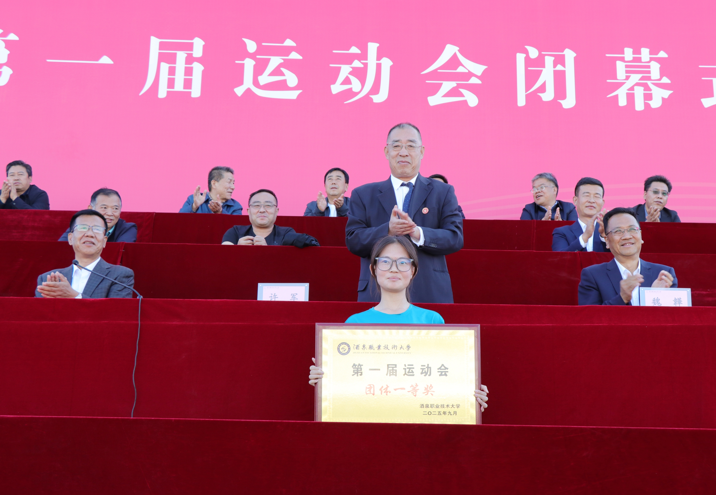 要闻快递 > 正文秋日赛场见证拼搏,奋进号角奏响华章。2025年9月29日,酒泉职业技术大学第一届运动会圆满闭幕。学校党委副书记、校长许军,党委委员、纪委书记、监察专员魏韡出席闭幕式。各学院师生代表、运动员、裁判员及志愿者齐聚现场,共同为这一盛会画上圆满句号。党委委员、副校长王金明主持活动。